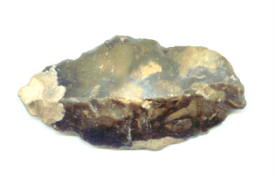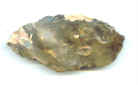 Je ne pense pas que ce soit taillé par l'homme : il manque : un bulbe, une surface d'éclatement quasi plane (sauf la zone du bulbe), les négatifs DES enlèvementS antérieurs sur l'autre face. Et s'il ya des quasi-retouches (je n'en vois pas, d'ailleurs sur ta photo) ou esquilles sur un 'tranchant', cela peut très bien être du piétinement ou phénomène du même acabit.