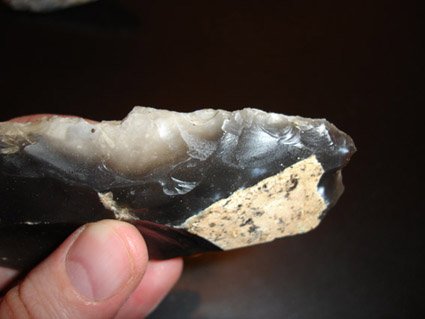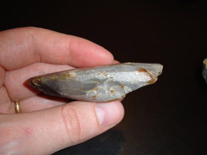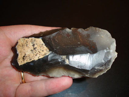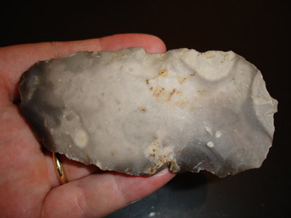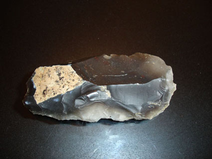 Pour préciser, le talon de hache fait approximativement 6-7cm (il est cassé en biseau), et le couteau fait 12 cm de long pour4 à 5 cm de large.
