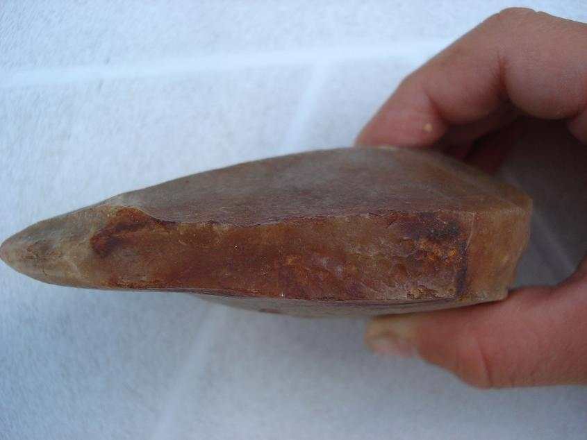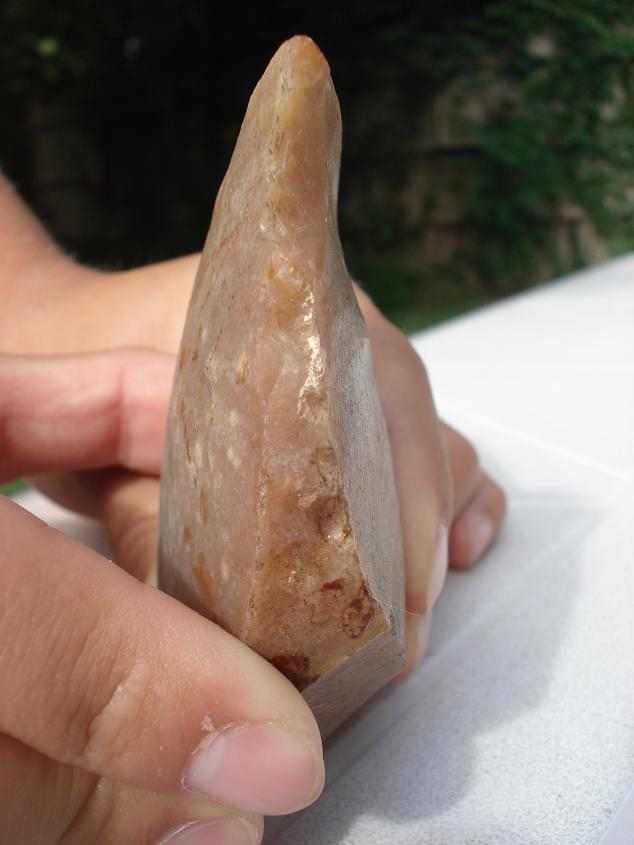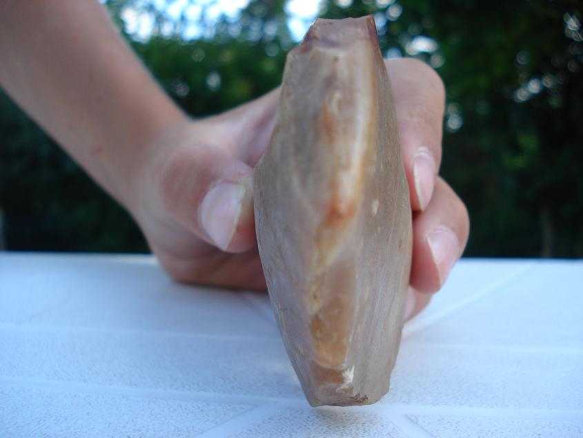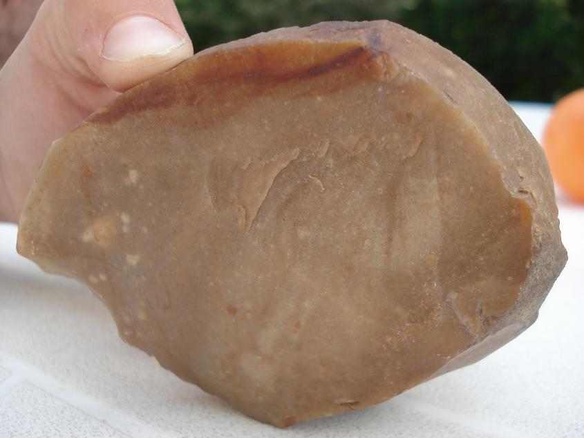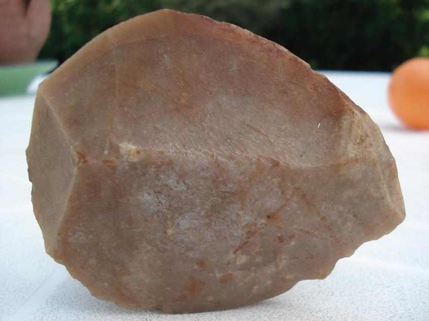 ...quand on l'a en main la texture de la matière est poreuse ...et moins froide... que celle d'un silex ...Son coté lavé-usé doit provenir du contexte où je l'ai trouvé, lit d'un ru...Est- il possible de dater cette pierre taillée ? A quoi ce type de débitage s'apparenterait-il ?merci encore et bonne nuit..