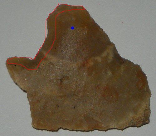Point bleu = bulbe de percussion. Point vert = face opposée située au niveau du bulbe.