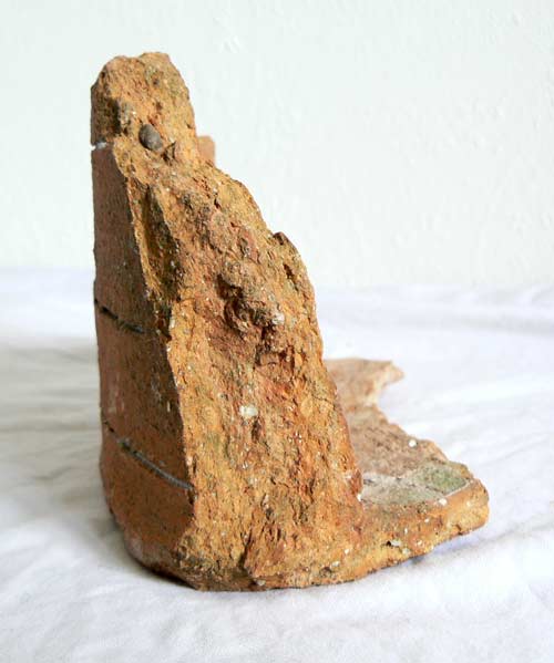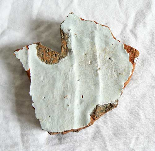 [229] Les poteries cuites dans ces fours étaient glaçurées, pour obtenir un faïençage, ces fours étaient de petite taille . Il n'est donc pas étonnant que l'intérieur ait été glaçuré par débordement des pièces à cuire ce qui donne cette faîence blanche. Je ne suis pas spécialiste, quelqu'un pourra sans doute confirmer (ou contredire celà va de soi!).