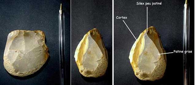 J'aurais voulu savoir si des participants au forum ont déjà constaté un tel phénomène (différence de patine entre le silex au centre des blocs et le silex sous le cortex).
