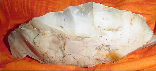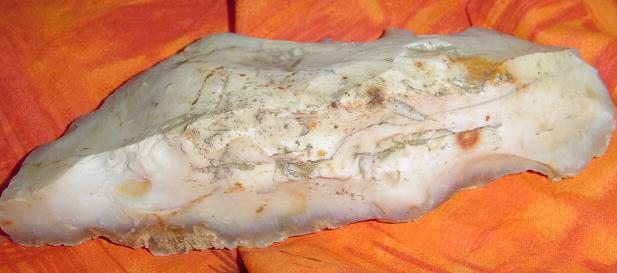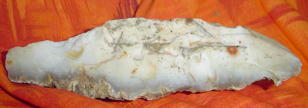 encore une fois, je me permet de faire appel à vos lumières ... voici la photo d'un objet en silex, trouvé dans le même champ que mon post précédent... s'agirait il d'un grattoir géant, ou une fois de plus , d'un nucléus qui servait à en extraire des lames . il est lui aussi assez gros : 16 cm de long, 6 de large. il y en a pas mal de ce type dans le champ, ils sont tous coupés en deux comme celui ci de manière très nette (mais on ne voit pas bien sur la photo), ou bien est ce une sorte de hachereau ?