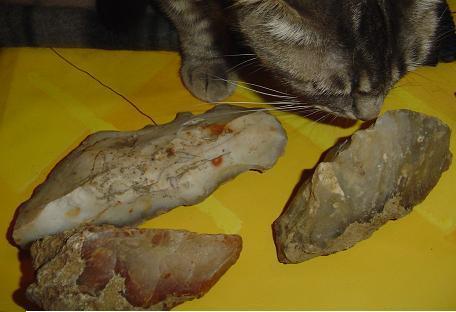 et il est aussi vrai que ces faibles retouches réalisées sont effectivement assez 'frustres', voici la photo des 3 que j'ai trouvé à peu près au même endroit , deux ont cette 'crête' assez pointue, et l'autre (l'orangé) me parait être un grattoir, assez frustre lui aussi d'ailleurs, mais ils sont tous les 3 assez imposants ! la tête du chat... désolée , c'était pas prévu ! mais finalement ca permet de comparer leur taille ;-)