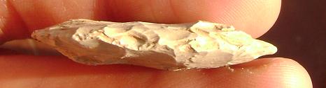 On voit bien les vestiges de ce qui fut un cortex, mais compte tenu de la taille de l'outil, j'ai du mal à zoomer sur les retouches...