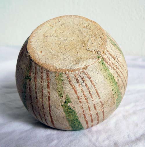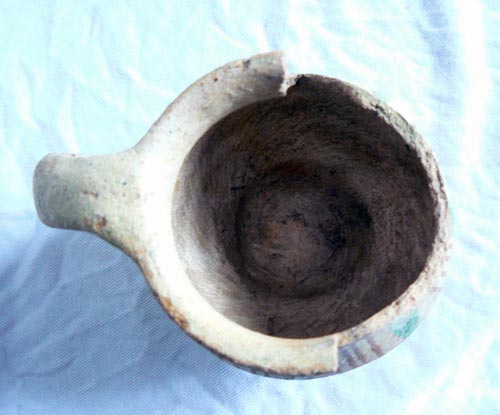 Ici il manque le rebord qui permettrait de savoir si c'est bien un 'chamber pot' ou un pichet. Puis je n'arrive pas à voir sur les clichés si la couleur de fond grise est un grésage ou la couleur brute.