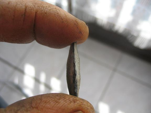 cette pierre fut trouvée de visu sur les pentes d'un volcan ( je suis d'Auvergne !) elle pourrait ressembler à une mini bombe volcanique (bien qu''elle soit pas tres bombée) mais les cotés tranchants et la forme (ils manquent les deux bouts pointus) me font penser à une pointe de fleche. j'ai deja trouvé sur le site des silex. pouvez vous m'aider et me dire s'il s'agit d'une veritable pointe??