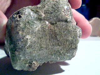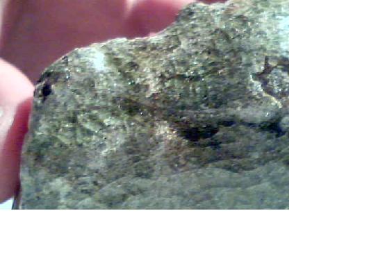 j'ai trouvé ce week end en normandie cette 'pierre' en plein milieu d'un champ, assez loin des habitations... la roche semble recouverte d'un couche transparente d'un minéral vert toute fissurée. cette couche fait un milli d epaisseur. dessous de la pierre grise! bizarre bizarre..