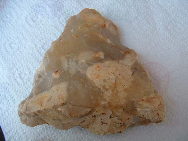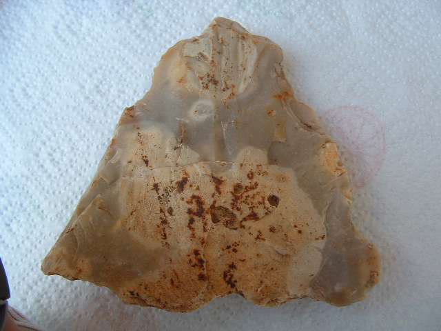 bonjour à tous ! j'ai trouvé ce silex triangulaire dans le 28, qui semble bien avoir été taillé ! quelqu'un aurait il une idée sur le sujet ? 11 cm X 10 cm
