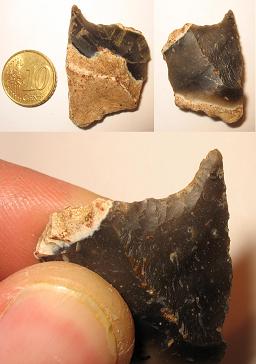 Pour R0, la pointe n'est pas cassée. Elle se termine en biseau, un peu comme une pointe de tourne-vis. Le coté droit de la pointe, qui est retouché, est très tranchant. Par exemple on peut aisément couper une feuille de papier avec le tranchant en perçant avec la pointe et en tirant vers la droite (sur la photo). Cela coupe comme avec une lâme de razoir, sans déchirer.