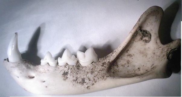 bonsoir, dans le champ ou je vais actuellement detecté je trouvais frequemment des dents pointues, y en a partout...et la j ai retrouvé une dent mais avec un morceau de machoire...longueur 5 cm,hauteur 2 cm, ep 3mm sur toute la longueur et 8mm vers l articulation...il y a une canine pointue et trois dents seulement...deux en forme de fleches et une en m au sommet pointu...je pense a un animal carnivore mais quoi?pas de dents manquantes sur la machoire...connaissait vous cet animal?petit chien??elevage de quoi??