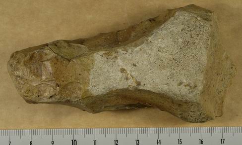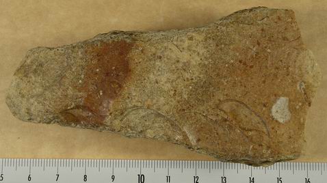 La couleur homogène entre les zones taillées et les restes de cortex laissent supposer qu'une modification chimique ou thermique s'est opérée sur le materiau.