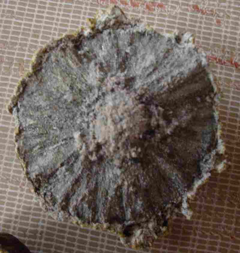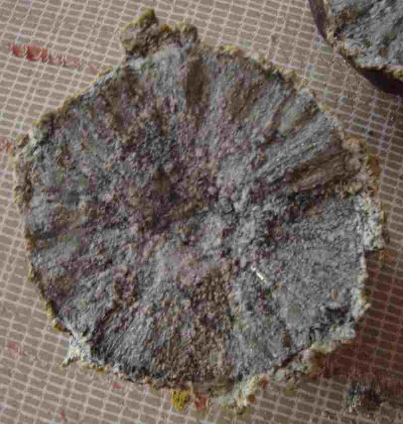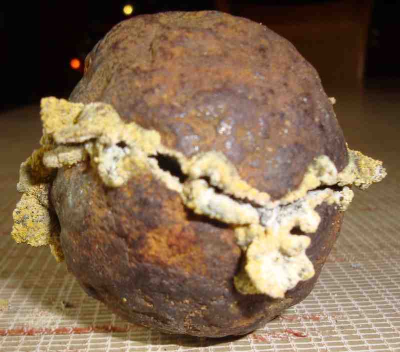 Il s'agit d'un nodule de marcassite. Il contient de la pyrite, de la bornite, de l'érubescite, et encore d'autres éléments. Ce qui 'dégueule' est du sulfure de fer. Ce genre de m.... pourrit tout ce qu'il y a autour... :o))