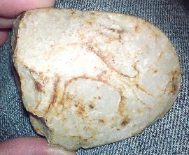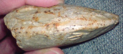 Le rêve devient réalité, joli morceau de hache, entière elle devait être énormeuuuu, enfin un bout c'est déjà xtra, bon coup d'oeil !! , j'hésite encore entre talon ou taillant, toujours difficile de juger, juste un conseil : ramasse tt le silex qui se trouve autour...et note le lieu de découverte !!!!