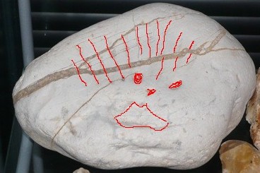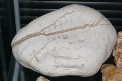 Parfois des formes apparaissent sur des galets. Ici un galet de calcaire calciteux hématisé ou à filonnets calcito-argileux.