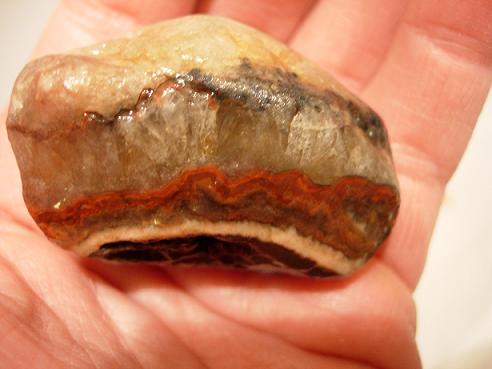 J'aurai fait nettement plus simple et moins précis, donc moins intéressant : morceau d'agate roulée par les flots de ta rivière à paillette. Morceau très esthétique.