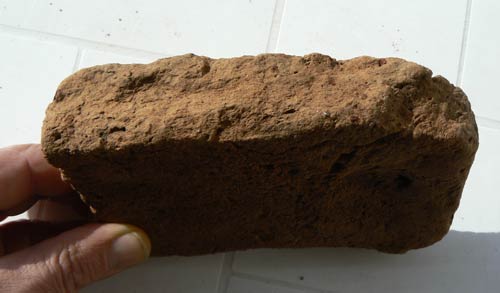 Cette brique me fait penser à une brique qui ne serait pas passée dans le four, juste le modelage et sèchage, d'ou cet aspect terreux,par contre il n'y pas de dégraissant .