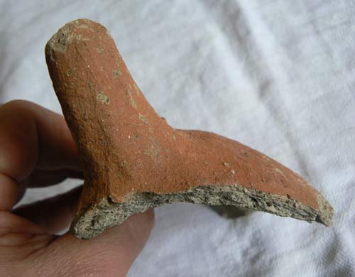 Trouvé ce tesson de tripode, la pâte est d'un gris clair alors que l'extérieur est orangé cela change de certain tessons que j'ai déjà posté