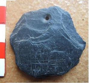 pour finir et préciser ma pensée au sujet de ta trouvaille, je joins une pendeloque en schiste ardoisier percée par une perforation biconique caractéristique, de plus, on observe des rayures volontaires faites sur l'objet.