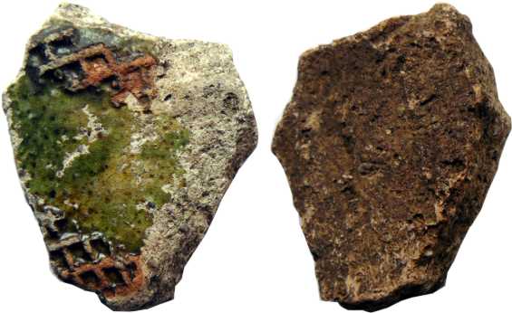 Je trouve en jardinant ou fortuitant dans mon jardin des micro tessons vernissés vert. J'ai réussi à mettre la main sur un morceau plus important :