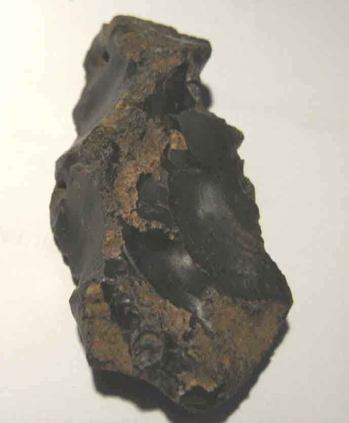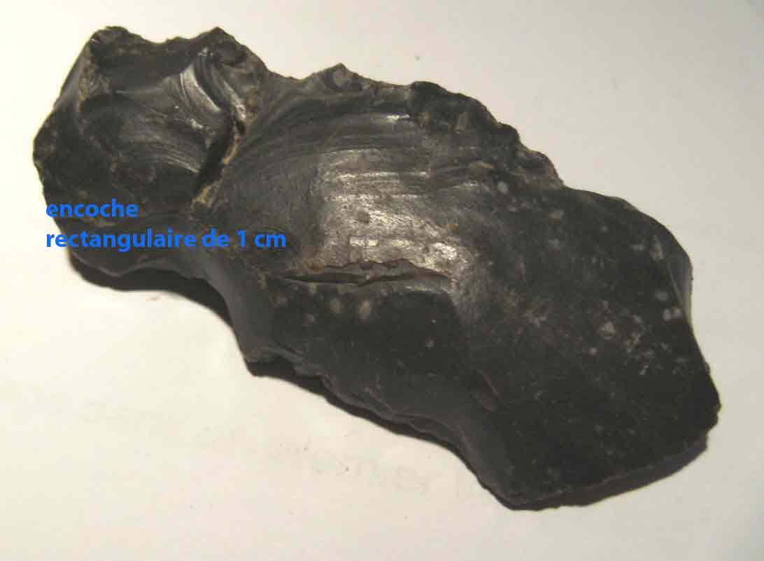 ..........silex pour identification, taille 7,5 cm, une encoche rectangulaire faite de 1 cm en haut de celui ci!!! silex taillé par l'homme semble t'il, pouvez vous me donner infos merci!