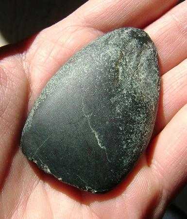 Toute fraîche de cette après-midi, trouvée dans la campagne aixoise : une belle hache polie (35 X 55 mm), d'un vert profond tirant presque vers le bleu !