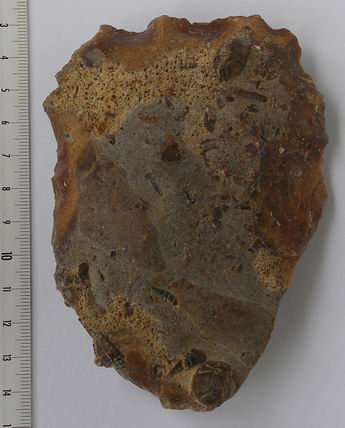 Je pense que c'est une préparation de biface avortée à cause du cérithe en haut à droite de R1 qui a provoqué un clivage.