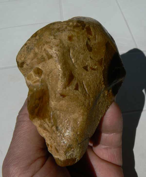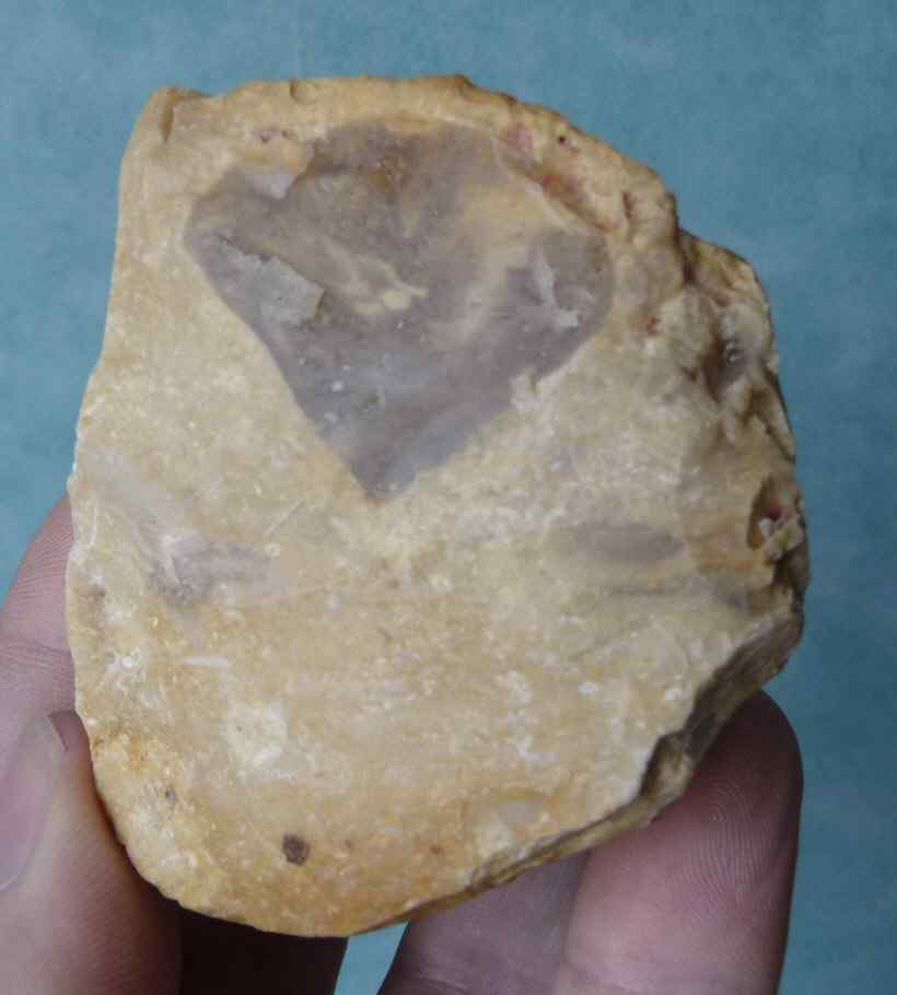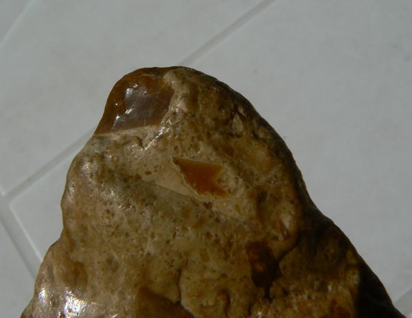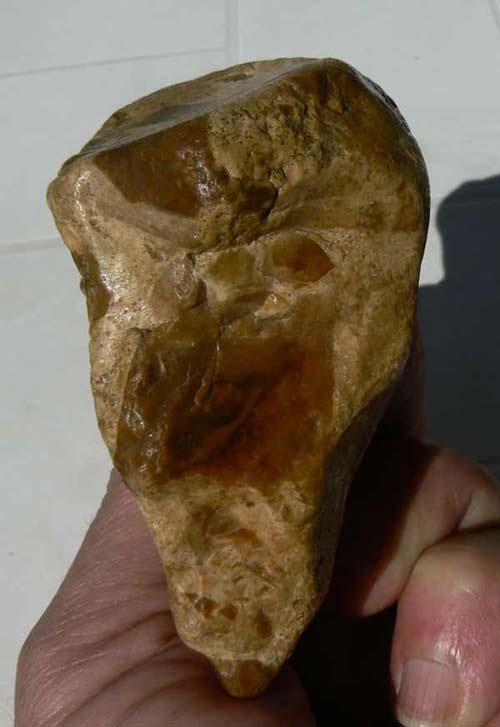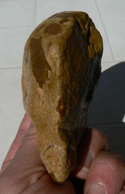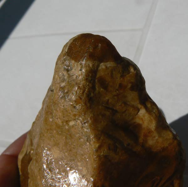 Mon titre doit vous paraître farfelu, mais cette pierre me fait vraiment penser à un gros morceau de nougat, cela ressemble à un amalgame d'éclats de silex dans une sorte de sédiment composé de sable de silex ( vu à la loupe ) aussi dur que le silex lui-même, ce sédiment n'a rien à voir avec un cortex. J'y vois des enlèvements (naturels ou pas ) ce qui lui confère une forme assez sympa genre coup de poing ou biface un peu épais, sur le dessus on remarque une forme concave, et sa pointe est constituée juste par un éclat. Merci pour vos avis, si vous pouvez me dire quel est ce genre de pierre et si sa forme est naturelle ou façonnée volontairement pour obtenir un outil, un percuteur par exemple?