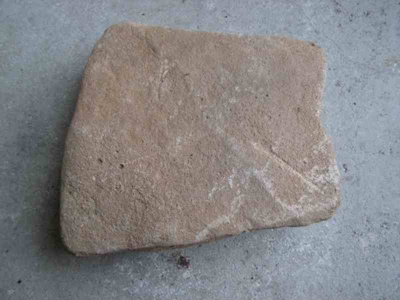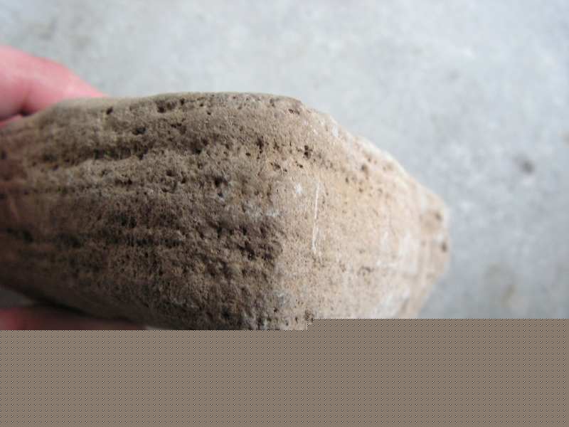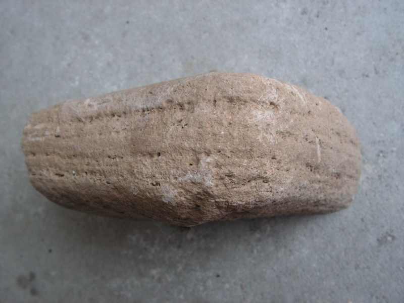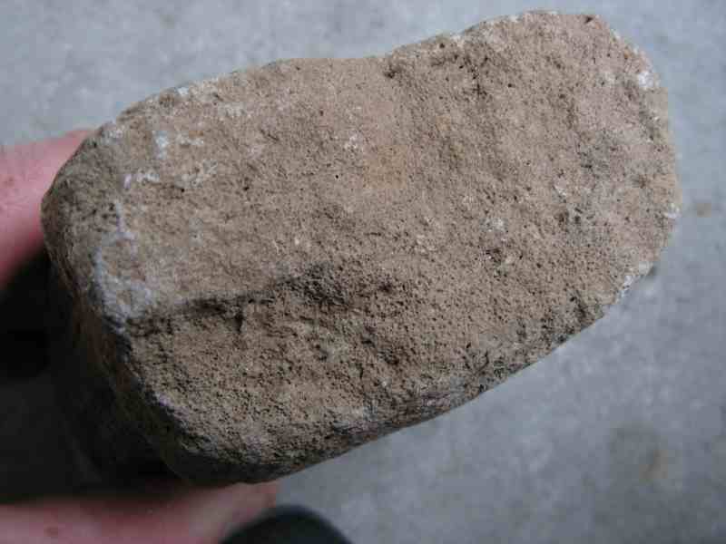 cette pierre mesure 12cm sur 10 cm et est cassée a sa moitié. Je dirais qu'elle est en calcaire mais je ne suis pas sur car elle est plutot dure et l'on distingue sur les photos plein de petits trous (je ne suis pas spécialiste). En tout cas elle a l'air d'avoir été taillée elle possède des angles. Je pense à un moellon ; pierre d'un édifice mais peut on le dâter sachant qu'il n'y avait aucun autre indice d'habitation dans le champ?