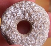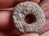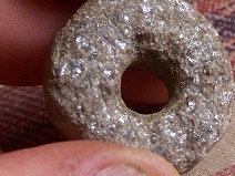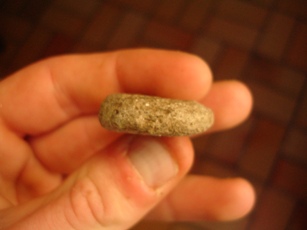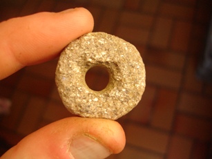 voici une fusaiole ou élément de parrure trouvé de visu hier en labour, j'ai des doutes sur ca fonction de par le matériau utilisé, au début je croyais à du granit, mais après j'ai plutôt pensé à du mika ou autre, en tout cas la pierre est très belle avc des paillettes pétantes !! (en fait ce sont comme des couches de paillettes qui sont les unes sur les autres), c'est pour ce la que ca pourrait tres bien avoir eu une fonction de perle de parrure ou autre (néolithique?), ou alors fusaiole peut-être : âge du fer ?