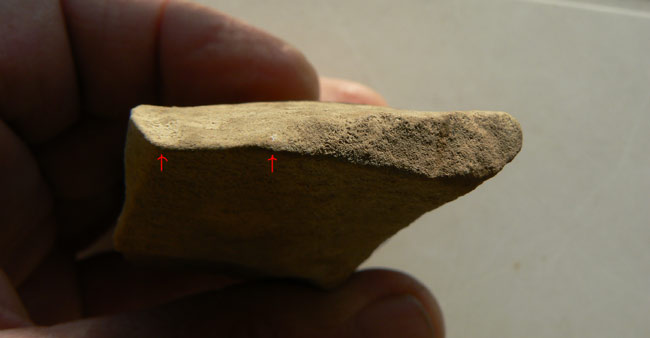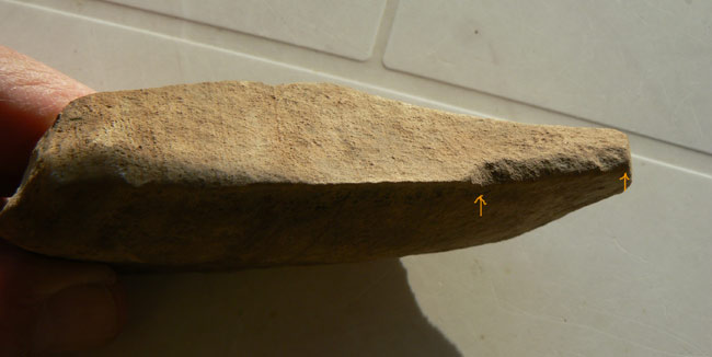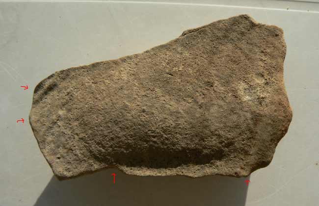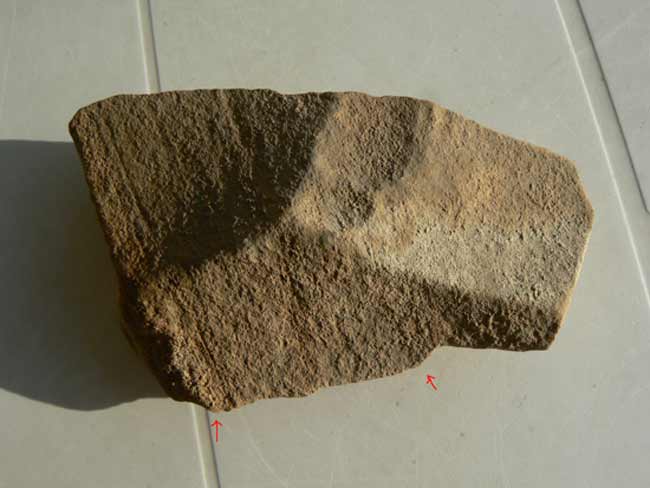Trouvé cette pierre qui me semble une sorte de grès très dur, je l'ai ramassée, un peu comme le chopper en quartzite de l'autre fois car j'ai trouvé que ces enlèvement ne me paraissaient pas naturels, en général les brisures naturelles sont soit en ' bec d'ongle ' ou anguleuses, ici je les trouve harmonieuses et courbes sauf que ce n'est ni du silex ni du quartzite, j'ai mis des petites flèches rouges pour indiquer ce qui me semble être des tranchants, sans retouches bien sur mais qui devaient bien racler quand même, le dessous en R1 est bien bombé, les petite flèches jaunes indiquent un enlèvement qui me parait bien appliqué.