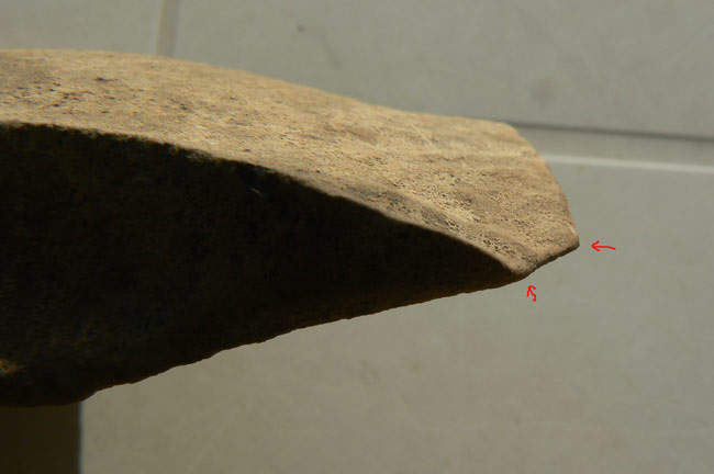 Le bombé n'a pas la bonne forme d'onde pour être un bulbe de percussion, idem pour les facettes trop plates et cette forme quasi triangulaire que je me souviens avoir vu pour les éolithes. Je crois même me souvenir que ce sujet a été abordé sur notre forum préféré, mais je n'ai pas pu retrouver le/les post(s) !