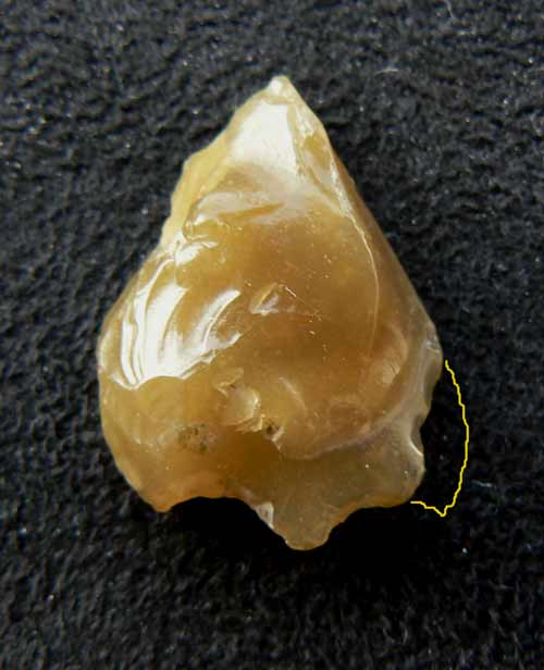 Trouvé ce petit silex blond de 25 mm de hauteur par environ 15 mm de large,il me fait penser à une petite armature dont un morceau aurait été brisé ( R1) et réaménagé en petit gratoir, on y voit deux petites retouches.