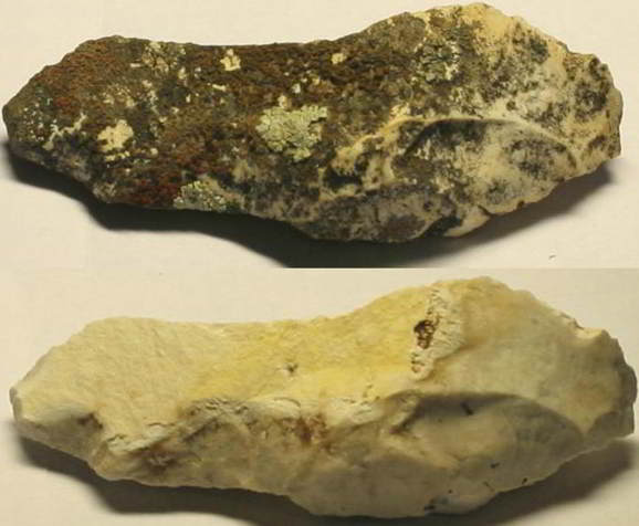 Donc après quelques tests, il semble effectivement que l'emploi de l'eau de javel (dilué) aide à enlever les mousses et lichens comme on peut le voire sur les photos. Pour le silex de la photo, celui-ci est rester environ 2heures dans la solution et à été ensuite brossé sous eau (avec savon), les résidus végétaux sont partis plutôt facilement.