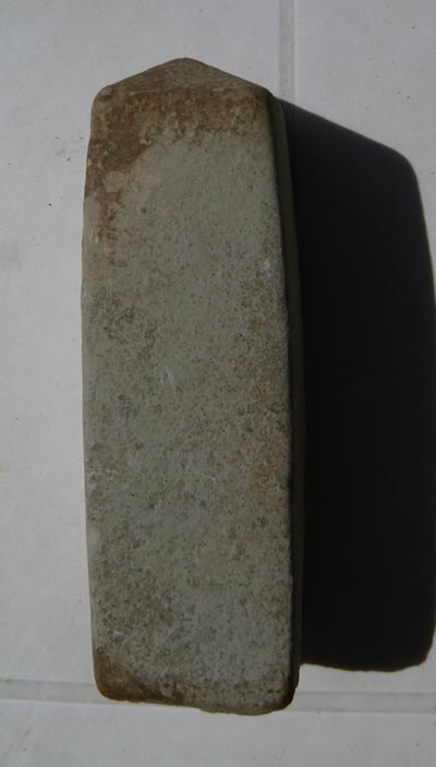 Trouvé cet sorte de petit obélisque en je ne sais quoi, il se termine en haut par une pointe de diamant et à sa base il y a une sorte de scellement très fin qui part facilement. Au début j'ai pensé à une sorte de pierre à aiguiser mais ils se raye aisément avec l'ongle, ça ne ressemble pas vraiment à du calcaire, à quoi cela pouvait-il bien servir ?? Il mesure environ 10 cts de hauteur par 3,5 de large. Merci pour vos avis.