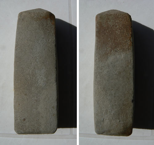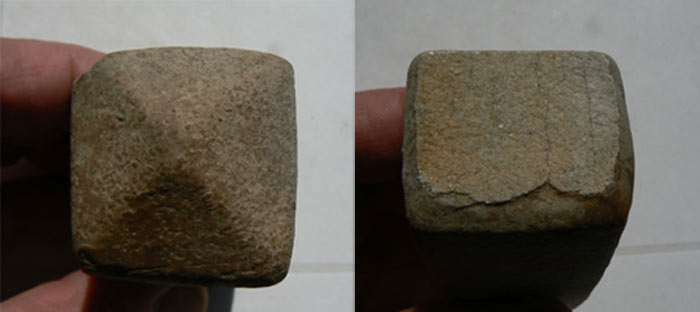 Merci pour vos avis, ce qui est sur, c'est que ce n'est pas une pierre à aiguiser, ni une pierre ponce, elle ne flotte pas, elle est même plutôt dense pour sa taille, elle pèse 300g, j'ai regardé de près la composition qui recouvre sa base, c'est des grains de quartz certainement mélangé avec de la chaux, uniformément posés et d'une épaisseur de à peine 1 mm. Ce n'est pas de la terre sèchée mais cela se raye facilement.Comme vous le constatez sur les photos, l'objet n'est pas d'une perfection absolue dans sa fabrication et lorsqu'on le pose sur sa base, il n'est pas vertical, il penche, cette même base est arrasée sur ses arêtes et il y a cette fameuse pointe de diamant. Le mystère reste donc entier. Cordialement.
