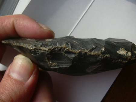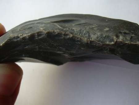 voici un silex qui me semble bizzare car pas de patine et tous biscornu sur un tranchant .
