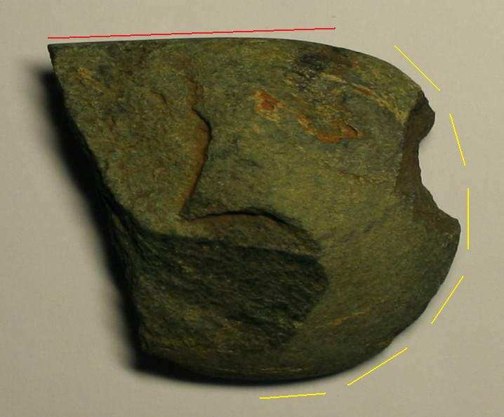 J'ai essayé de figuré avec le trait rouge sur la photo la position du coté poli de la hache et avec les trait hachuré jaune la position du tranchant de la hache...
