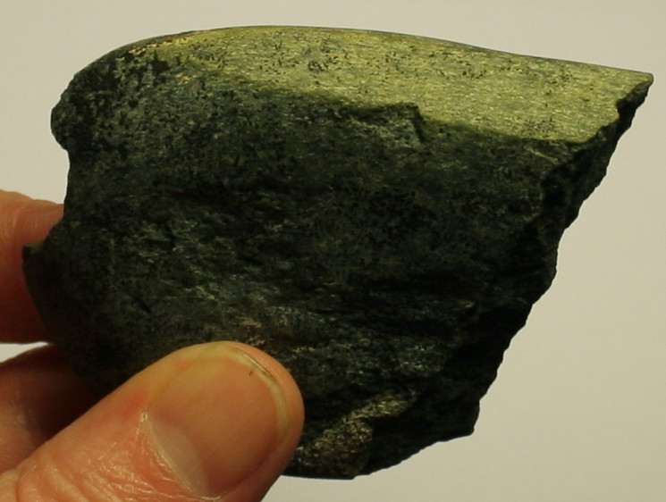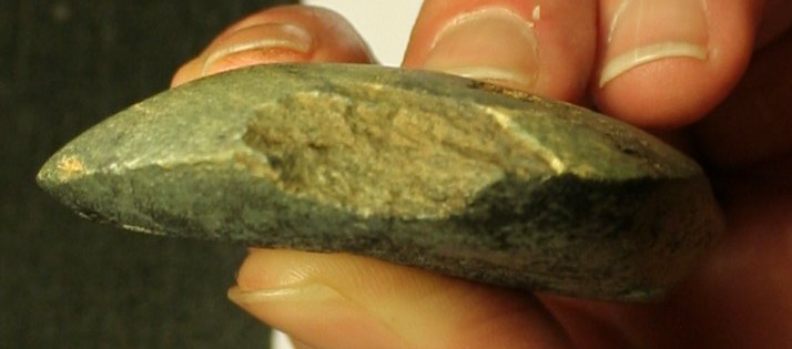 Pour la matière cela ressemble à de la fibrolite ,matériau donnant plutot des haches 'minces'.J'aurais pu dire dolérite mais la couleur (si c'est la bonne) est trop verte.