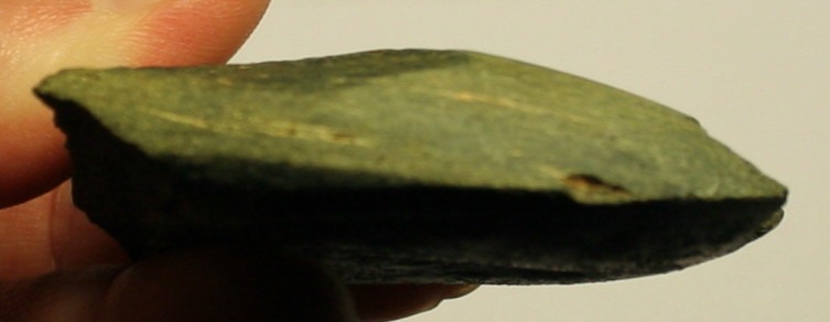 Concernant la couleur (ça dépend un peu de l'éclairage), la face polie est verte-foncé, vert-bleu, par contre au niveau des cassure 'fraîche' elle tend vers le bleu foncé avec une nuance de noir et de vert.