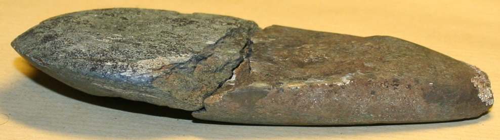 J'ai trouvé cette semaine le talon de ce bout de hache que j'avais posté il y a 4 mois à environ une 20aine de mètres du premier morceau (marrant d'ailleurs, car il était posé au pied d'un gros caillou à moitié enterré... (j'appellerais bien ça un rocher, mais c'est un peu petit...).