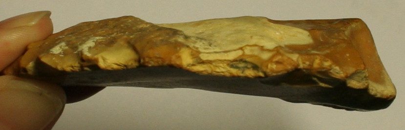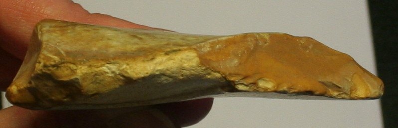 Celui-ci est en tres mauvais etat, presque entièrement déshydraté et par endroit (comme la zone blanche en R1) la patine a disparu et laisse apparaitre l'interieur crayeux du silex déshydraté.