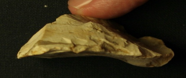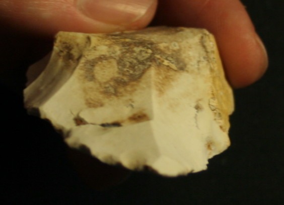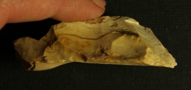 * le silex de droite. S'agit-il bien d'un tranchet ou d'autre chose. D'après le bouquin, celui devrait avoir un tranchant bien plats (??) or ici il y a une espèce de retouche allongée (accident lors de l'utilisation ?) sur la gauche. On distingue aussi en bas à gauche (juste au dessus de la retouche allongée) un enlèvement circulaire, s'agit-il du fameux coup du tranchet ?