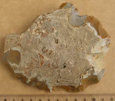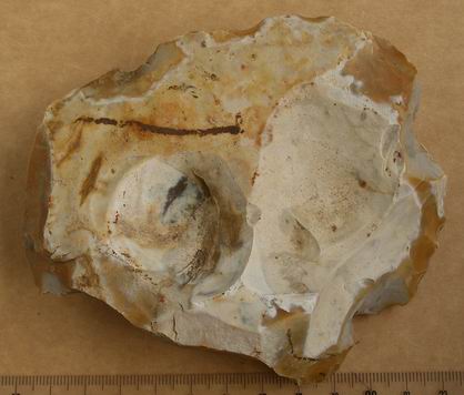 Pour la pièce en question, la surface gélive avec ses cupules est la surface initiale. de ça j'en suis sûr. C'est donc un éclat de gel assez plat (comme un biface naturel) sur lequel ont été pratiqué des enlèvements sur la périphérie pour l'aménager en outil. Comme il manque des morceaux (en haut à gauche en R0 et des éclats récents dûs aux machines) c'est dur à apprécier.