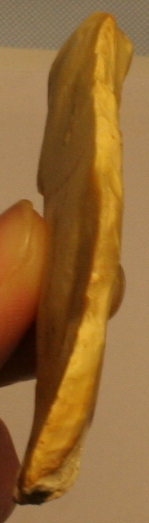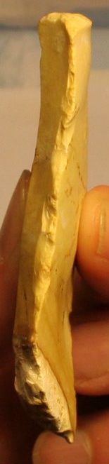 On ne voit pas bien l'extrémité côté talon qui semble avoir été travaillé . Pour ce qui concerne le côté retouché il est peut-être plutôt aménagé pour faire un racloir. En R2, on voit bien le profil.