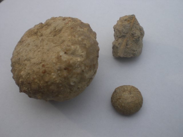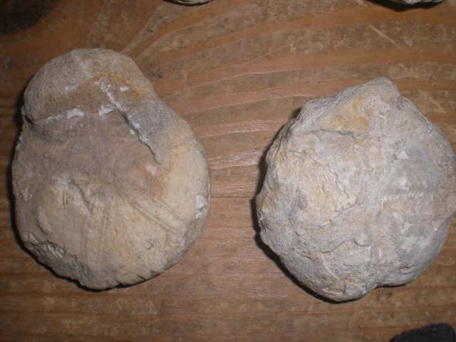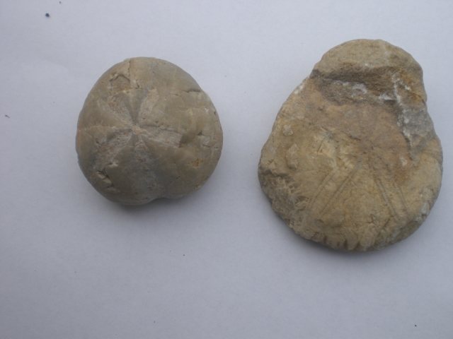En R10, l'oursin de gauche est un 'Pygaster' jurassique. Celui de droite est du Crétacé;