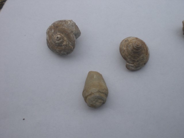 En R0, 3 moules internes de gastéropodes, les deux du haut Pseudomelania?, celui du bas Aporrhaidea (Pterocera?);
