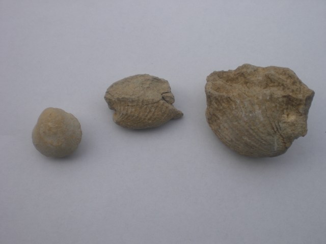 En R5, à gauche brachiopode Terebratulidae (il faudrait une vue de l'autre côté, probablement Zeilleria), les deux de droite lamellibranches, au milieu Arcidae (Arca), à droite ??