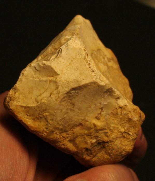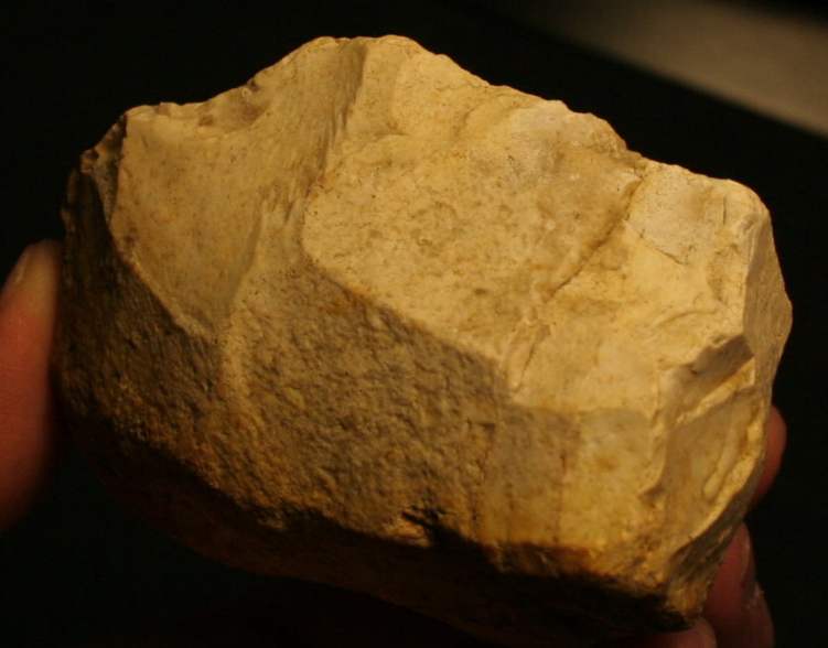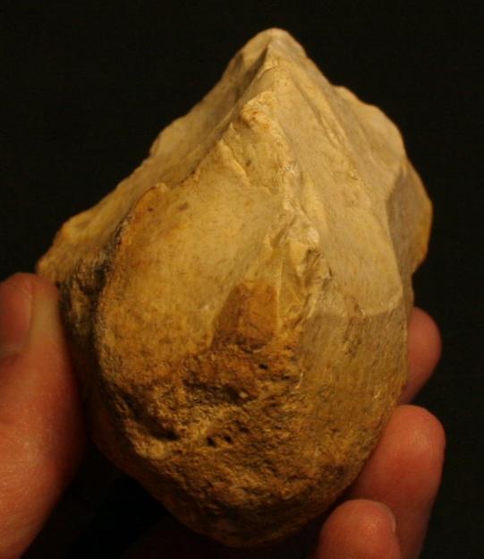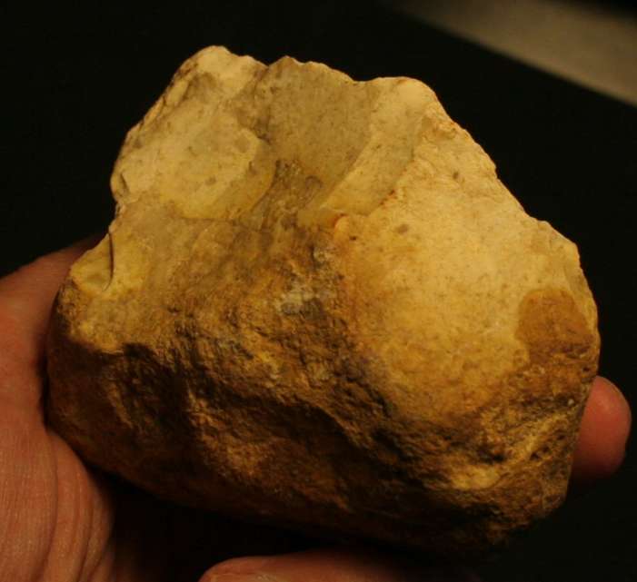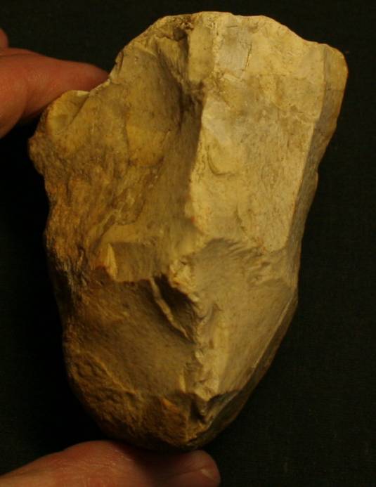 Trouvé à une cinquantaine de mètres de la 'pointe' en bordure d'un chemin (c'est fou ce que l'on trouve dans les chemins par ici...), ce galet de silex sur lequel une arête 'tranchante' a été aménage. S'agit-il d'un chopper ou d'un nucléus ?