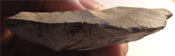 et pour l 'éclat de gel c est impossible il s agit juste d un debitage anterieur dont le point de percussion à été enlevé par l autre eclat en dessous; en d autre terme il est anterieur au debitage de l eclat qui se trouvr juste dessous ,de plus on voit tres bien sur cet eclat des belles ondes de choc . l outil est couvert de retouche sur l autre face
